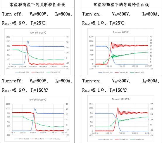 同时,清纯半导体与国内领先的功率模块供应商紧密合作,根据新能源汽车电驱动系统的具体需求(1200V/800A),对采用S1M014120H和国际主流厂家同规格SiC芯片制造的多芯片并联功率模块在常温及高温的开关性能做了详细表征,采用S1M014120H制造的模块的常温和高温情况下关断和导通特性如下图所示: